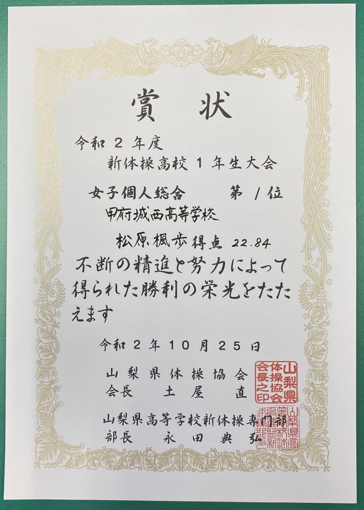 新体操では、1年生の松原楓歩が個人総合優勝。種目別においてもフープ・リボン共に優勝することができました。