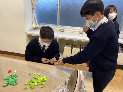 広島への修学旅行に向けて、千羽鶴を作成しています。原子爆弾の投下により亡くなられた方々への追悼と平和を祈って作りました。