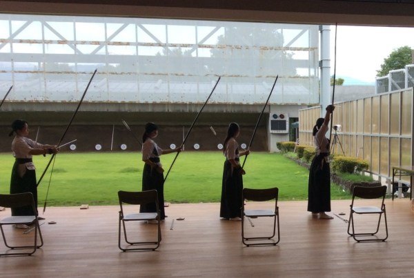 1日目 本校からは選抜された男子5名・女子6名が参加しました。1年生にとって初の大会でしたが、緊張しながらも落ち着いて弓を引くことができました。