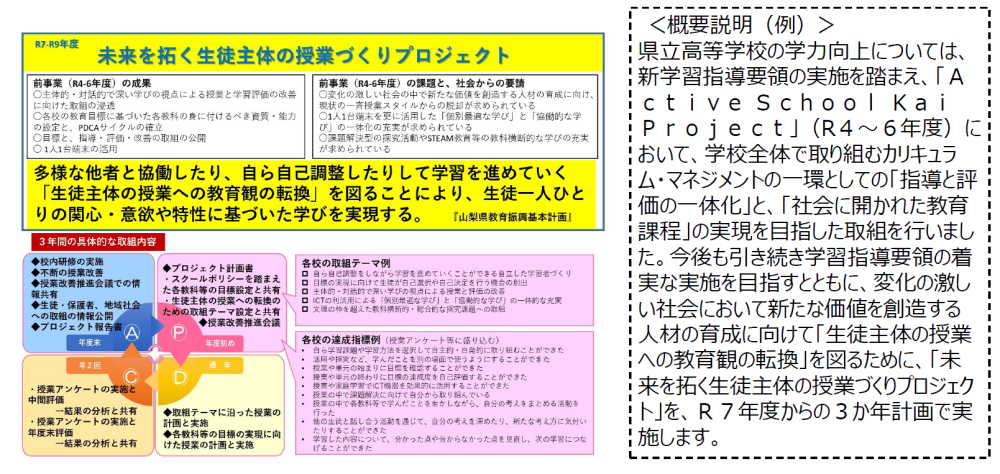 ホーム > 情報公開 情報公開 学校運営協議会令和7年度第1回学校運営協議会議事録令和7年度第2回学校運営協議会議事録令和7年度第3回学校運営協議会議事録 いじめ防止 甲府城西高校いじめ防止基本方針 学校評価令和4年度令和5年度令和6年度令和3年度令和2年度 令和元年度 平成30年度平成29年度平成28年度平成27年度平成26年度平成25年度平成24年度平成23年度平成22年度平成21年度 多忙化改善への取り組み令和2年度版 改善計画 部活動活動方針 部活動活動方針 学力向上プロジェクト 報告書報告書見方R6報告書R7~9プロジェクト概要 R7~9報告書見方R7報告書 個人情報個人情報の管理及び保護に関する規定 学校危機管理学校危機管理マニュアル 入札公告契約締結後の公表「令和7年度日直代行業務」発注の見通しの公表「令和7年度日直代行業務」契約締結前の公表「令和7年度日直代行業務」 入札結果令和7年度 液化石油ガス指名競争入札結果令和6年度 灯油指名競争入札結果令和6年度1号館及び2号館空調機更新工事 入札結果令和6年度マリンバ指名競争入札結果契約締結後の公表「令和6年度日直代行業務に係る労働者派遣契約」令和5年度 印刷機賃貸借 指名競争入札結果表令和5年度 1号館5階1502系統及び1504系統教室空調機更新工事 入札結果令和5年度 3号館3階ラボ系統空調更新工事 入札結果令和4年度 気化熱冷風機指名競争入札 入札結果冷房設備設置事業について今年度から、授業における使用率が週50パーセント以上の特別教室に対する冷房設備の設置が始まります。山梨県ホームページの学校施設課ページにおいて冷房設備設置の経緯等を公開中です。 県立高等学校への冷房設置について 就学支援金について2025年7月3日(木)に各年次・各クラスで配布がされました、就学支援金に関する手続きのマニュアルとなります。在学している全員が申請の対象となりますので、以下を参考に手続きをよろしくお願いいたします。※2・3年次生で、7月3日以前に昨年度同様の手順で申請を行っている場合、スタディサプリにて案内がありますのでご確認ください。 ①令和7年度新入生向け就学支援金入力マニュアルはこちらR7年新入生向け就学支援金入力マニュアル②令和6年度以前に入学している2・3年次生徒向けマニュアルはこちら【2・3年次向け】継続届出マニュアル【2・3年次向け】変更手続マニュアル③その他臨時支援金申請マニュアル